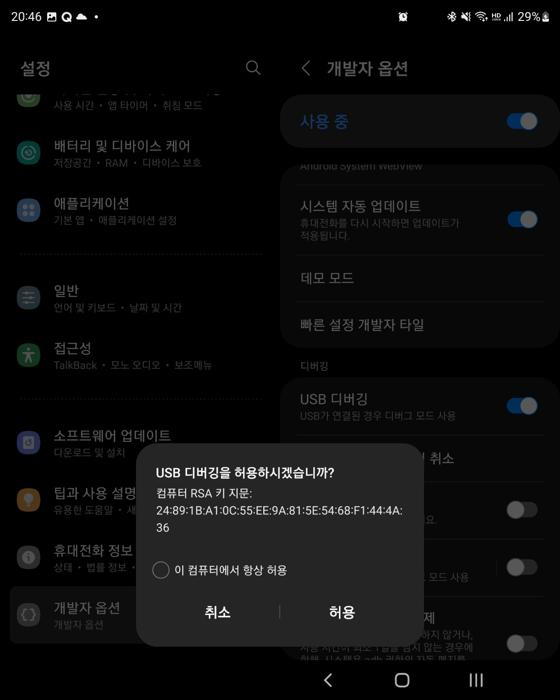 개발자 옵션 > USB 디버깅 설정을 ON 한다.