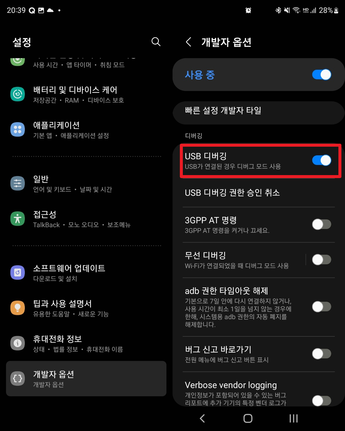 개발자 옵션 > USB 디버깅 설정을 ON 한다.