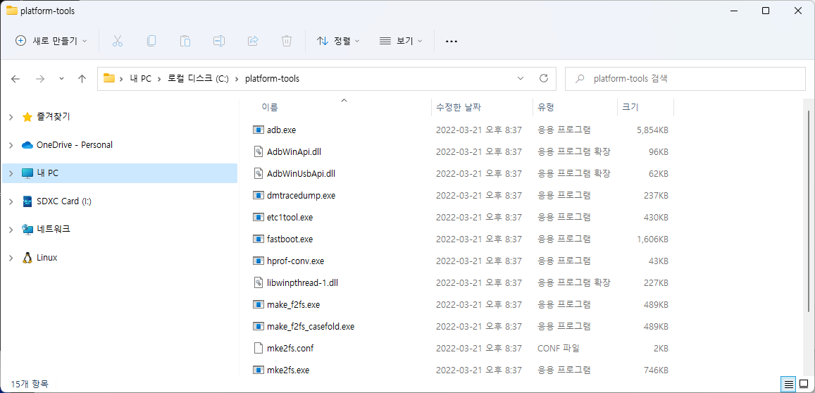 여기서는 C:\platform-tools 에 풀었음.