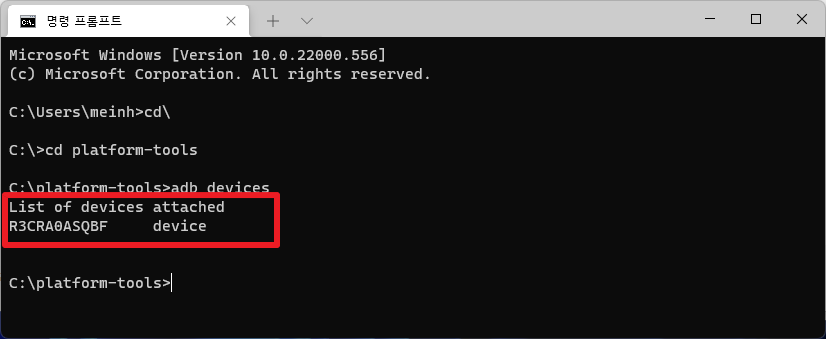 cmd > C:\platform-tools 로 이동 해서 다음과 같이 실행해서 정상적으로 연결이 되어 있는지 확인한다.