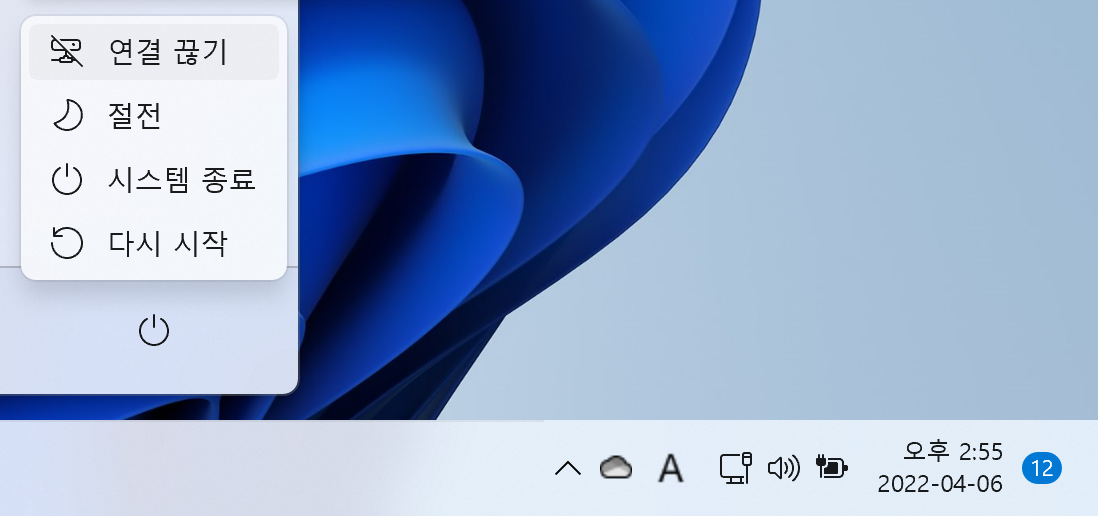 완전히 연결을 끊는 경우에는 시작 > 전원 > 연결 끊기로 연결을 끊으면 된다.