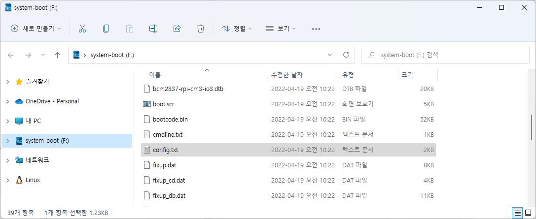 firmware 폴더는 FAT32 파티션으로 되어 있으므로 SD카드를 윈도우로 가져와서 config.txt 파일을 직접 수정해도 된다.