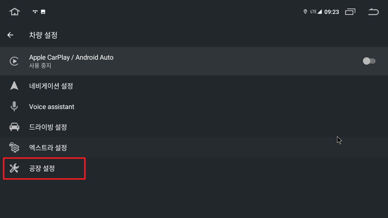 1. 설정 -> 차량 설정 -> 공장 설정 메뉴 진입.