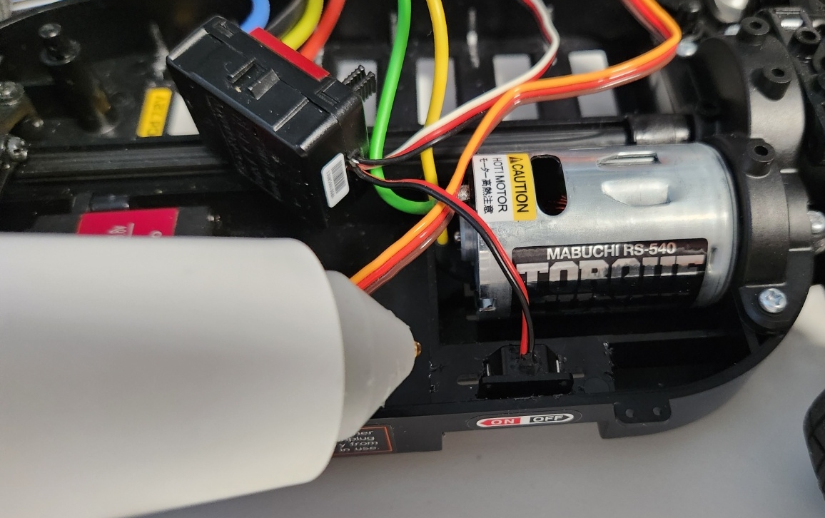 그 후 배터리 고정 기둥이 바닥으로 내려가지 않도록 볼트를 글루건으로 고정한다.