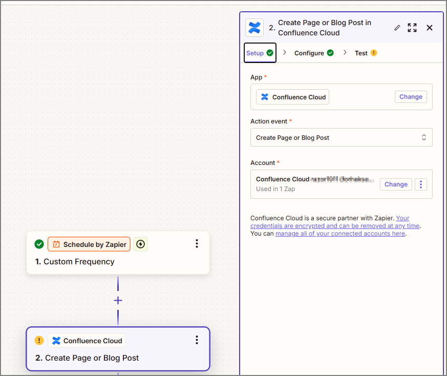 App 에 Confluence Cloud 를 선택 -> Create Page -> Confluence Cloud 어카운트를 연동시킨다.