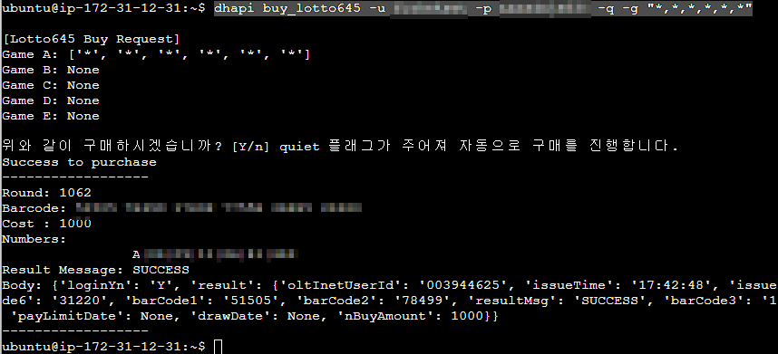 dhapi buy_lotto645 -u <아아디> -p <패스워드> -q