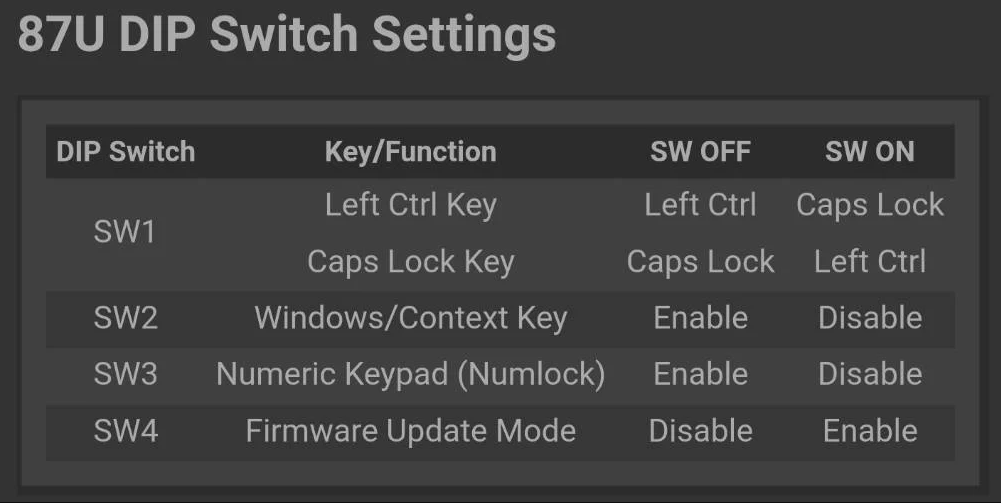 리얼포스 키보드 바닥에 보면 4개의 dip 스위치가 있는데, 이 스위치의 역할은 다음과 같다.