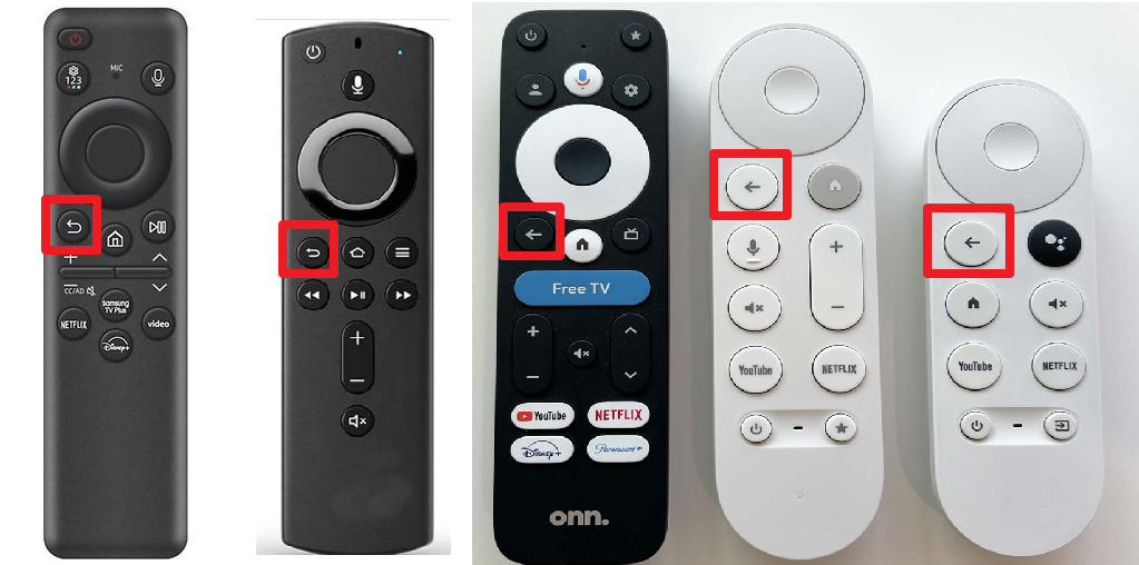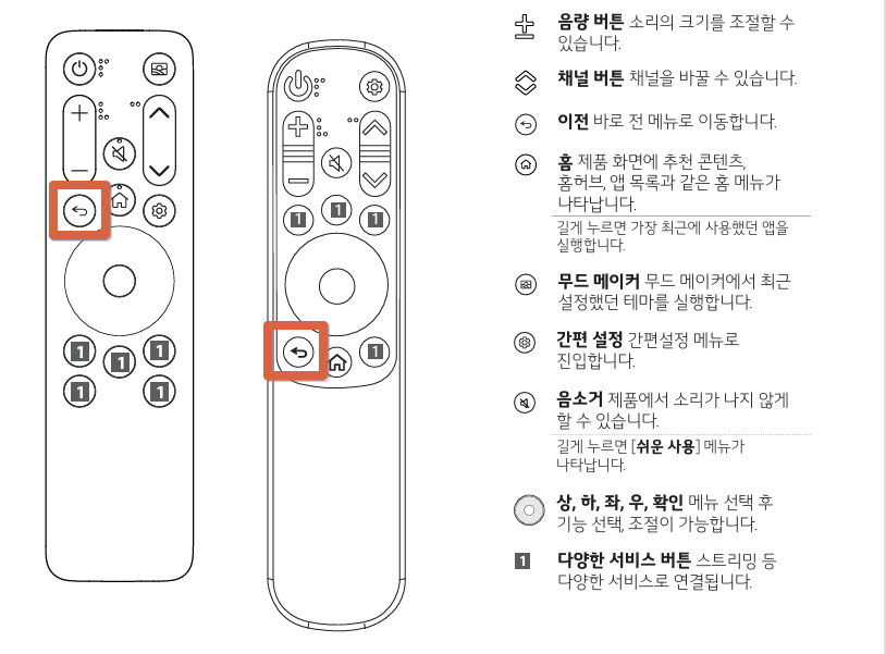 왼쪽이 상위 모델에 들어가는 리모컨인데, 보시면 뒤로가기 (이전) 버튼이 방향키 위에 위치하고 있습니다.