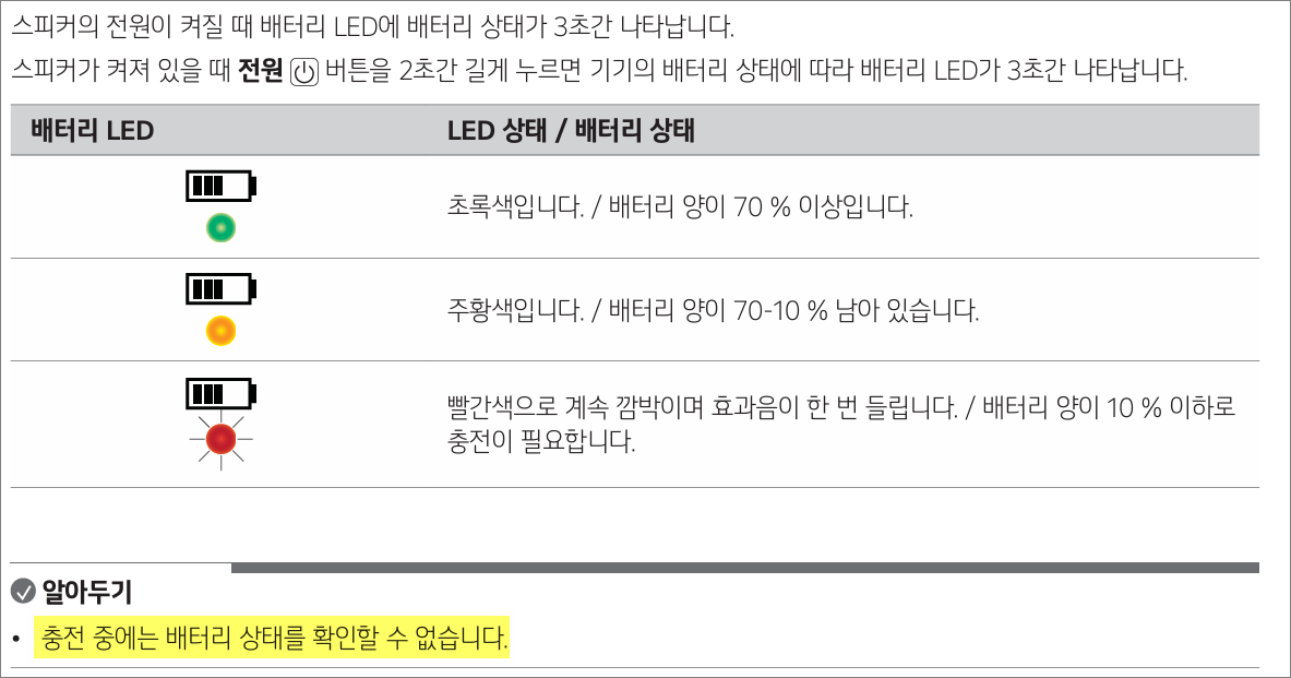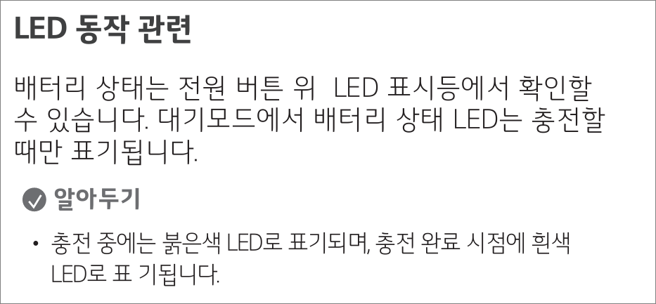 충전 시 배터리 잔량을 전원 버튼 옆 LED로 확인할 수 없습니다.