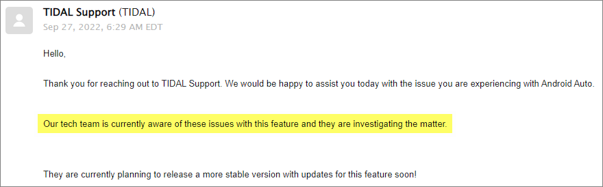 이 이슈를 TIDAL에 문의했더니 이미 알고 있는 이슈이며 해결을 위해 노력 중이라는 답변이 왔다.