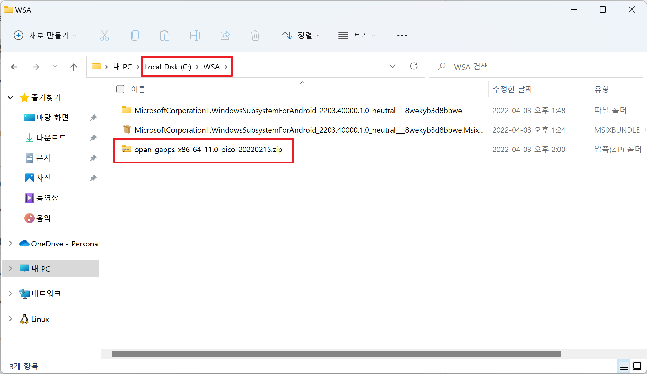 다운로드 한 파일을 C:\WSA 하위로 이동시킨다.