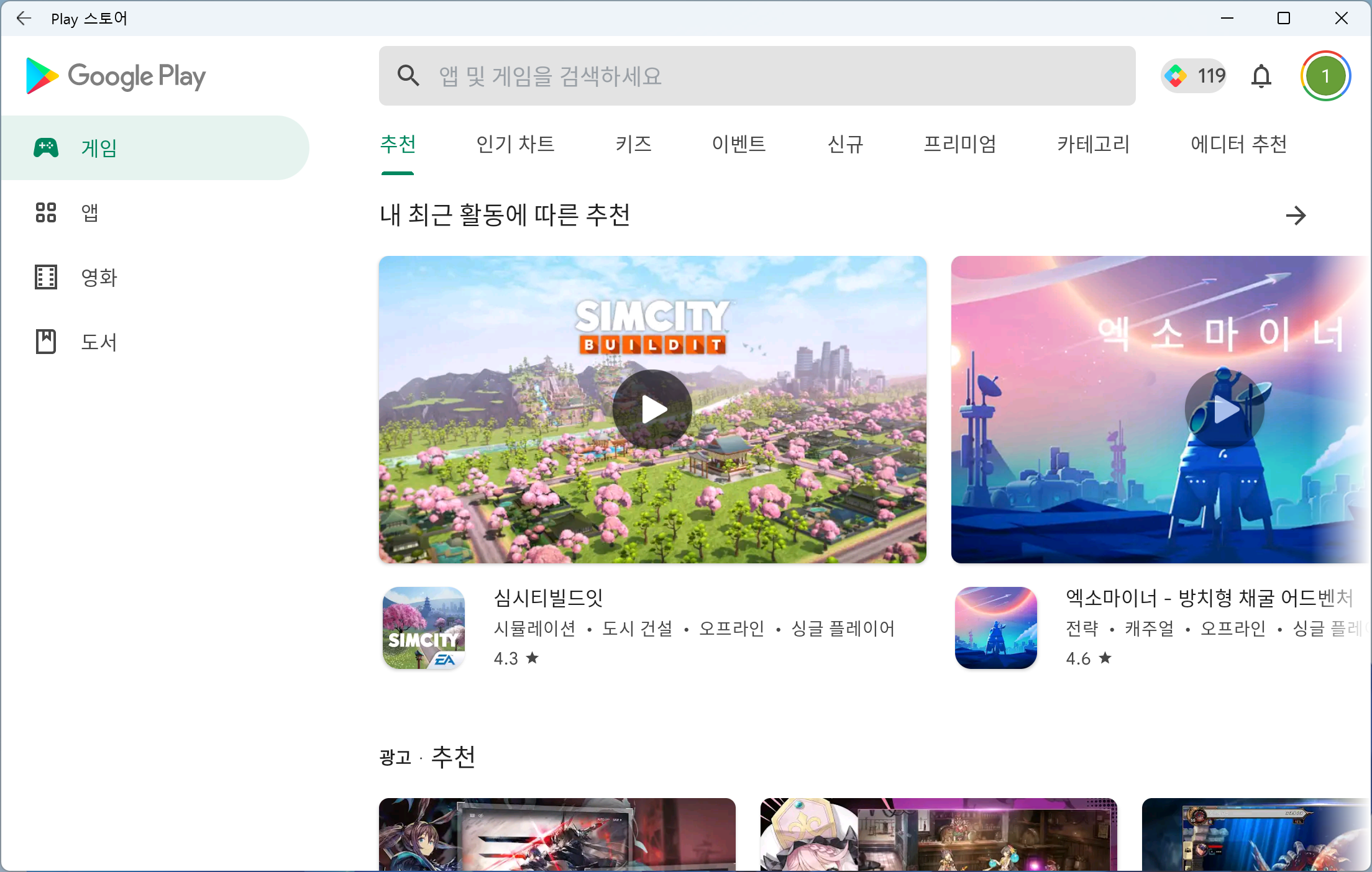 검색 > Play 스토어를 실행해서 구글 계정으로 로그인한다.
