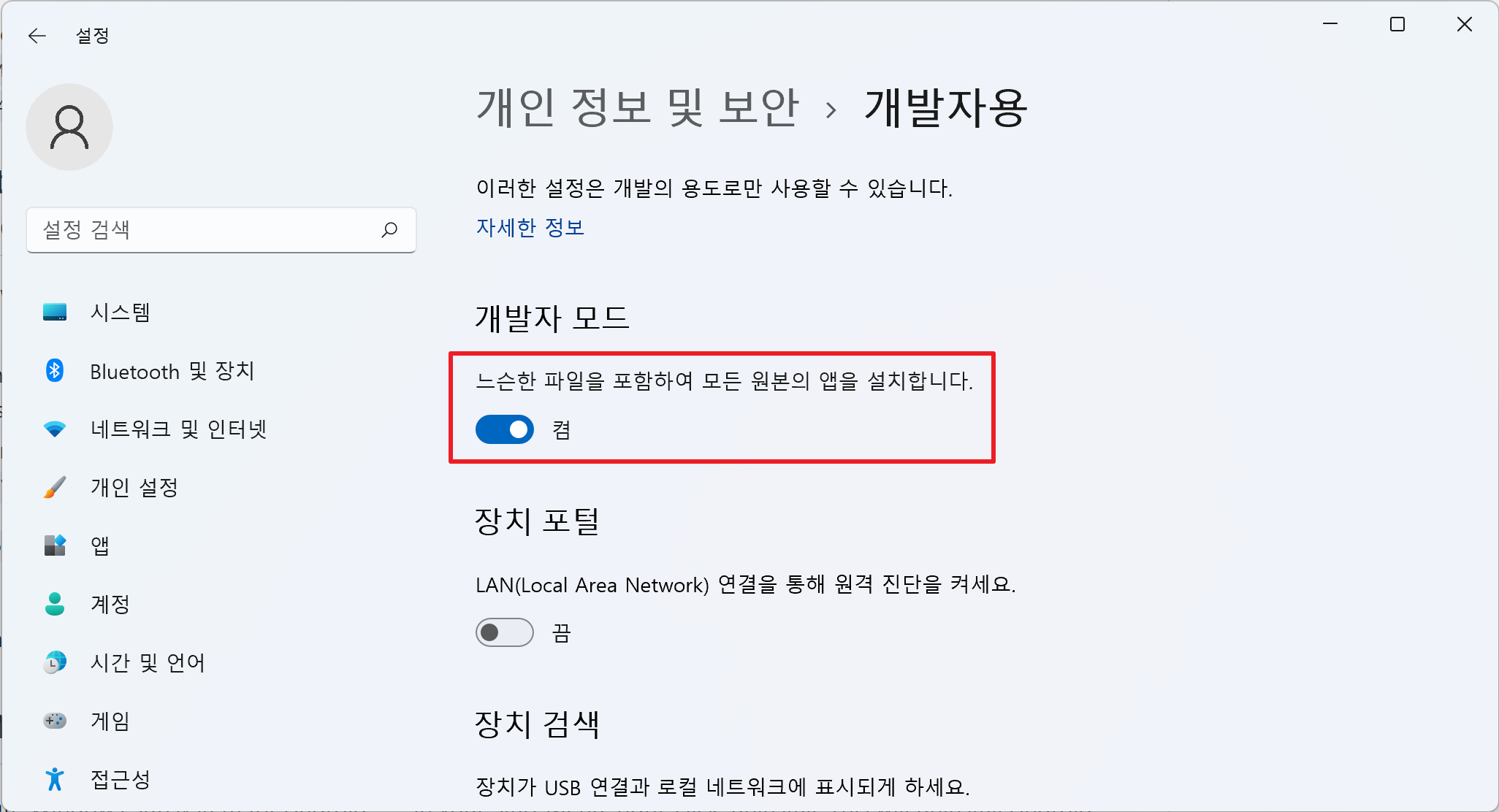 검색 > 개발자 설정 검색 후 메뉴 진입 가능.