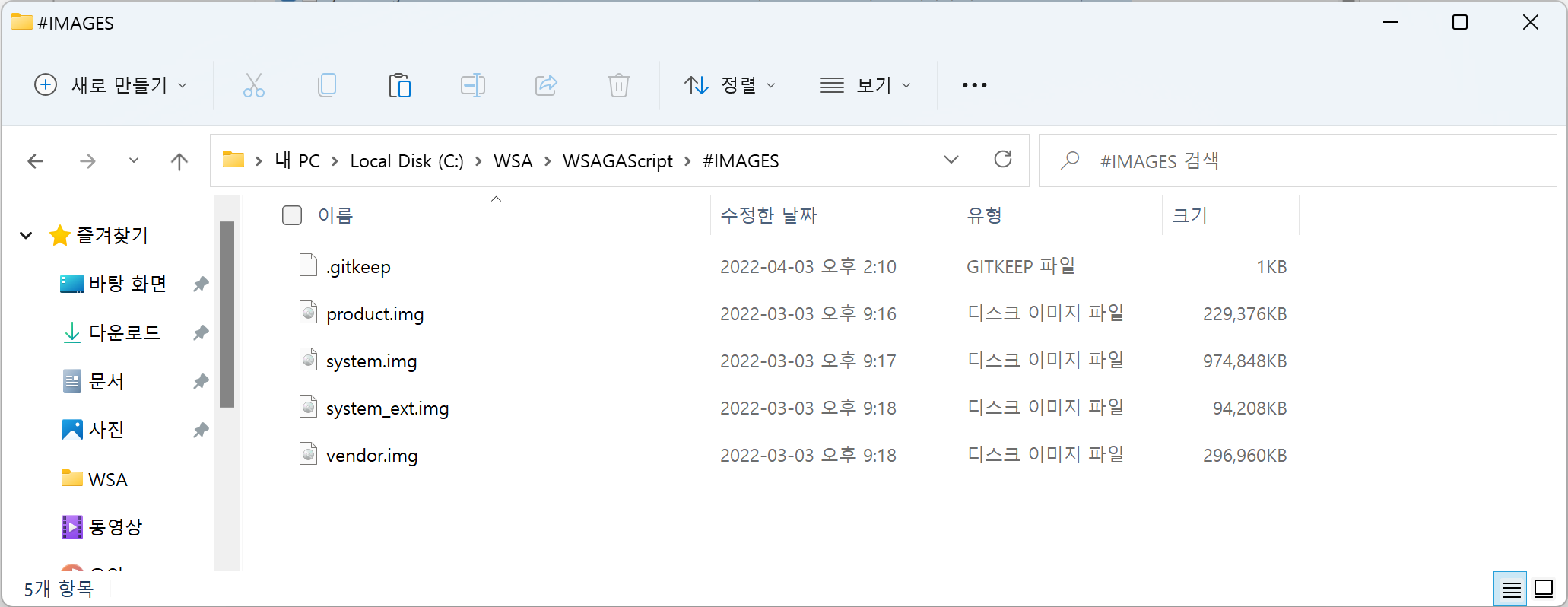 앞서 압축을 해제했던 C:\WSA\MicrosoftCorporationII.WindowsSubsystemForAndroid_2203.40000.1.0_neutral___8wekyb3d8bbwe\WsaPackage_2203.40000.1.0_x64_Release-Nightly 폴더에서 img 파일 4개를 C:\WSA\WSAGAScript\#IMAGES 위치로 복사한다.