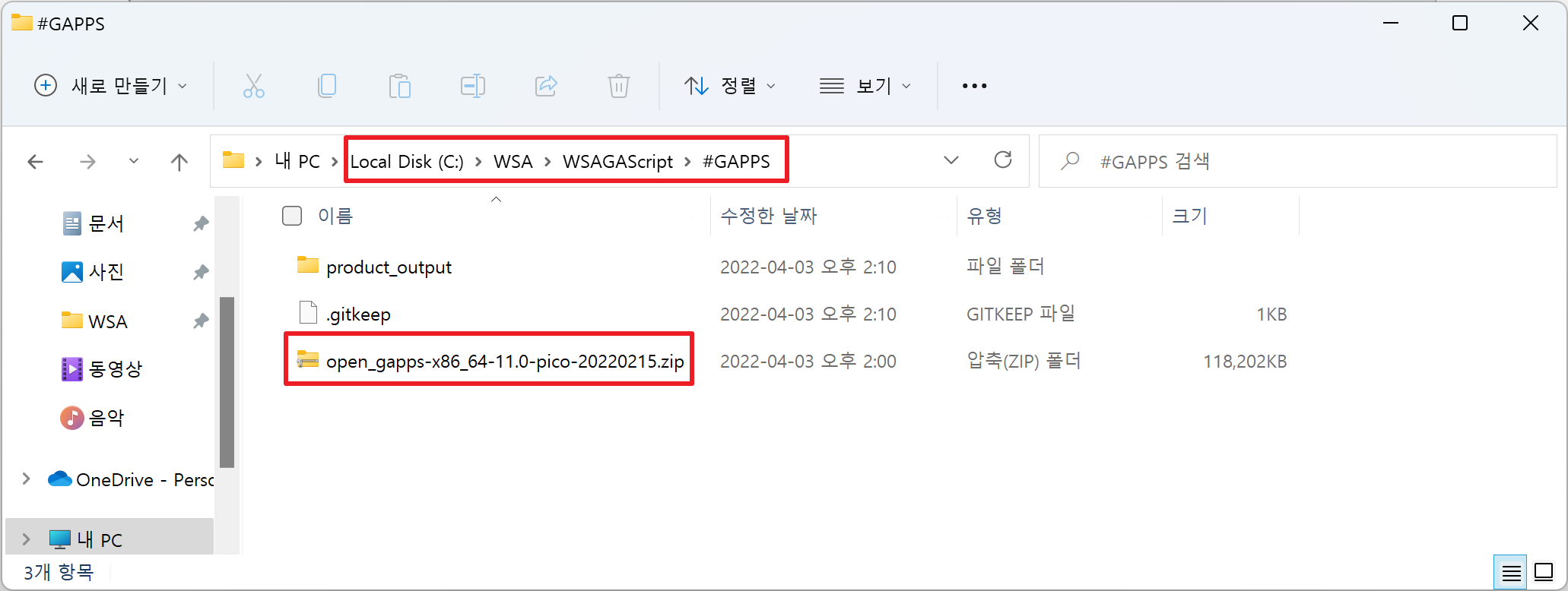 앞서 받아둔 open_gapp-x86_64-11.0-pico-xxxxxxxx.zip 파일을 C:\WSA\WSAGAScript\#GAPPS 로 복사한다.