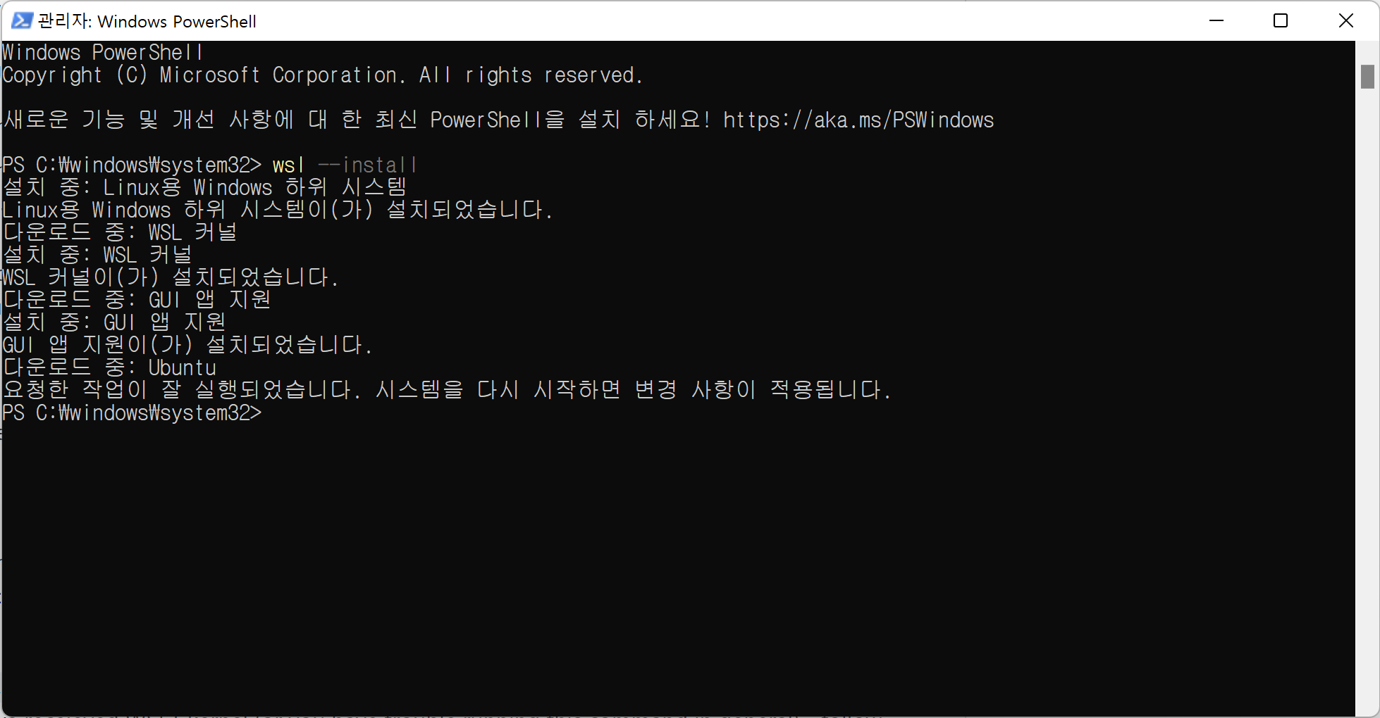 시스템 파일, 커널, GUI 앱, Ubuntu 등 필요한 구성요소가 모두 설치되면 재시작을 하라고 표시된다.