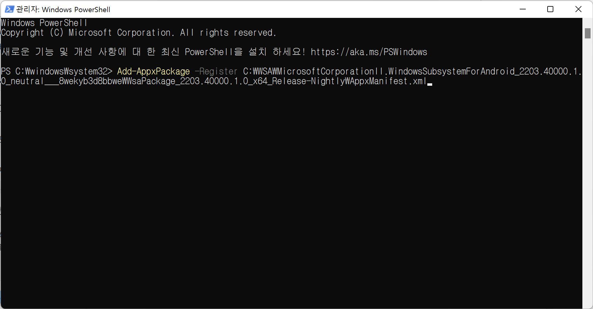 Add-AppxPackage -Register C:\WSA\MicrosoftCorporationII.WindowsSubsystemForAndroid_2203.40000.1.0_neutral___8wekyb3d8bbwe\WsaPackage_2203.40000.1.0_x64_Release-Nightly\AppxManifest.xml