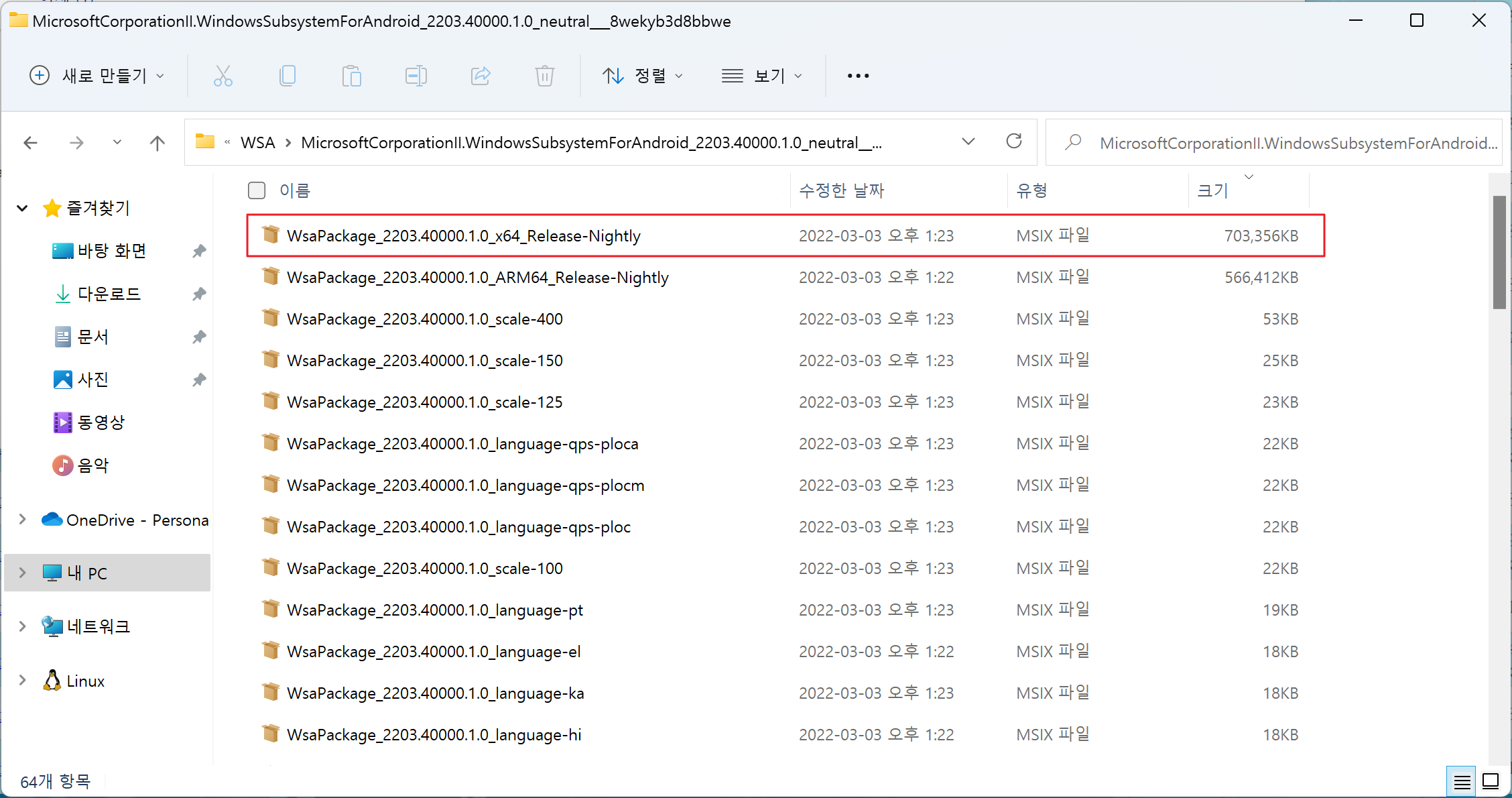 경로 C:\WSA\MicrosoftCorporationII.WindowsSubsystemForAndroid_2203.40000.1.0_neutral___8wekyb3d8bbwe\WsaPackage_2203.40000.1.0_x64_Release-Nightly