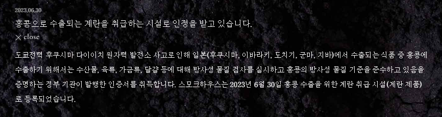 홈페이지 최신 공지사항에는 2023년 6월 30일자 홍콩 수출 허가 내용이 있다.