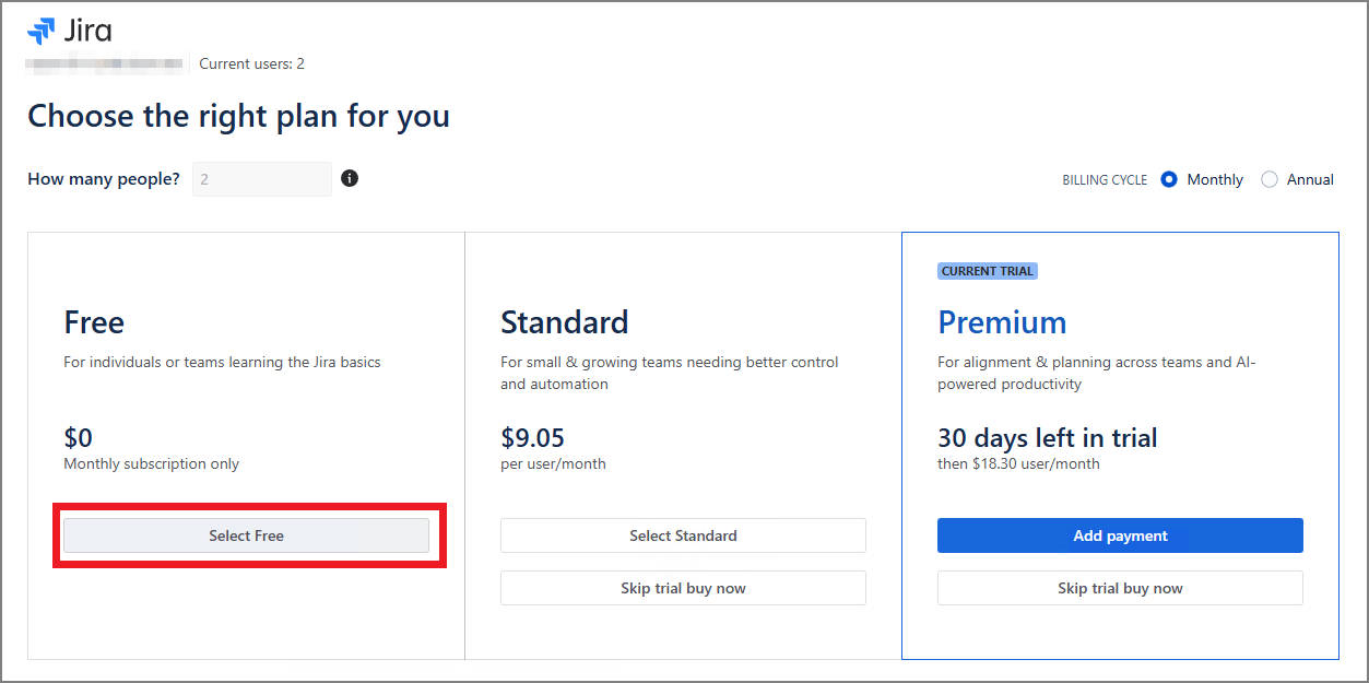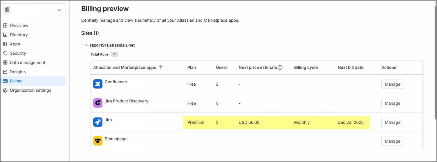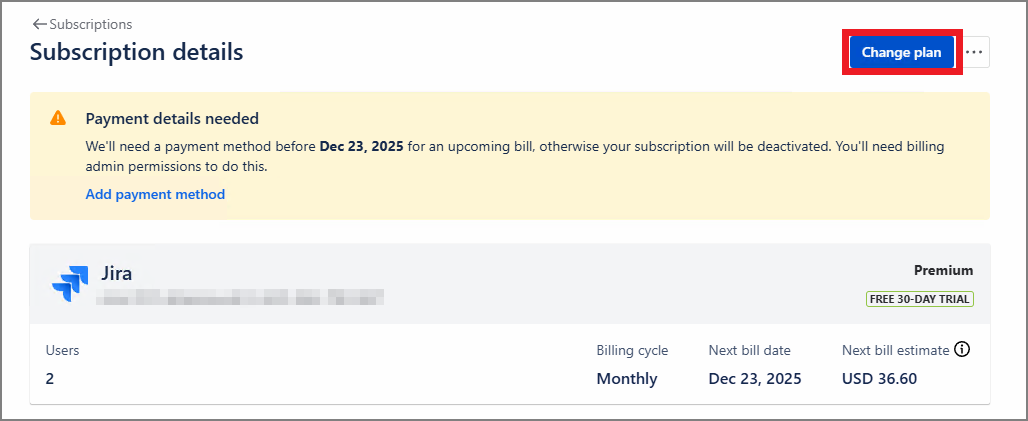 다시 청구 화면으로 가보면 놀랍게도 Jira 가 한 번 더 Premium 평가 버전이 적용되어 있다.