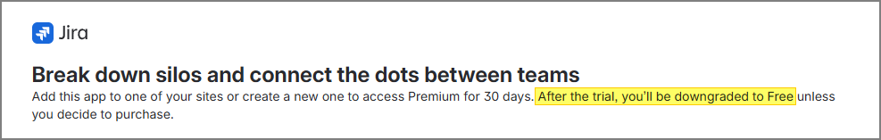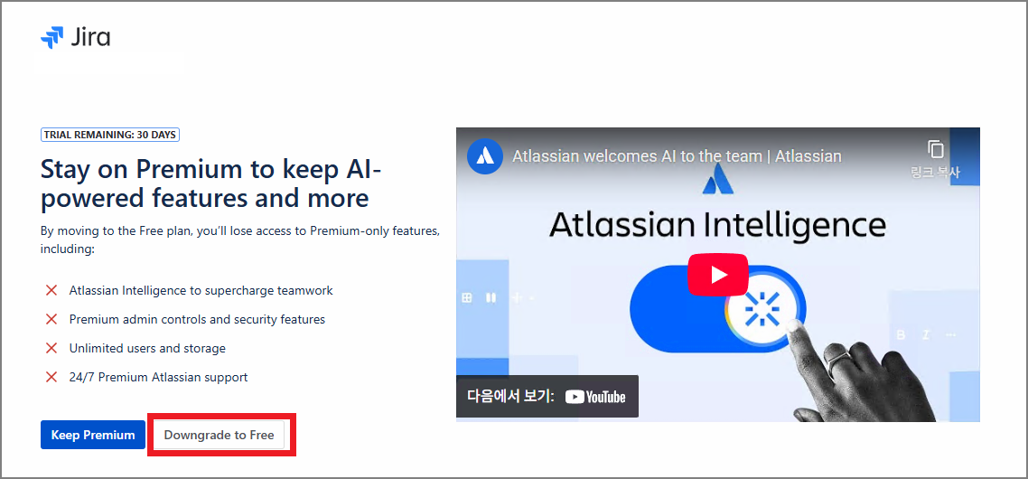 Jira / Confluence 앱을 생성해보면, Premium Plan 평가 기간이 끝나면 자동으로 Free Plan 으로 전환이 된다고 명시되어 있다.