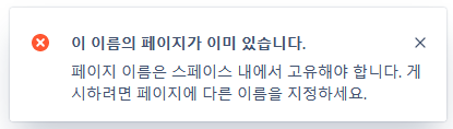 만약 동일한 페이지명으로 발행을 시도하거나 동일한 타이틀의 페이지를 이동시키려고 하면 아래와 같은 경고 팝업이 발생하면서 페이지가 이동/생성되지 않는다.