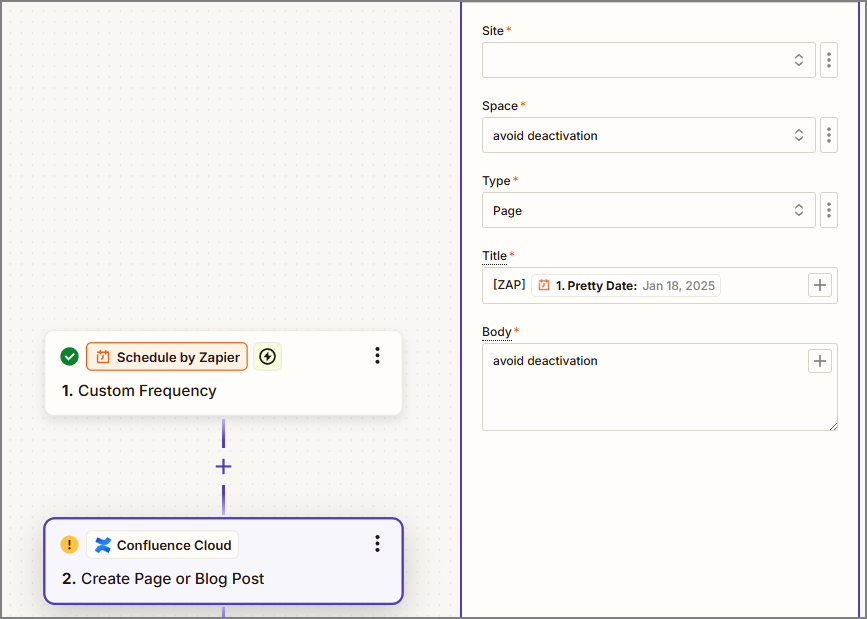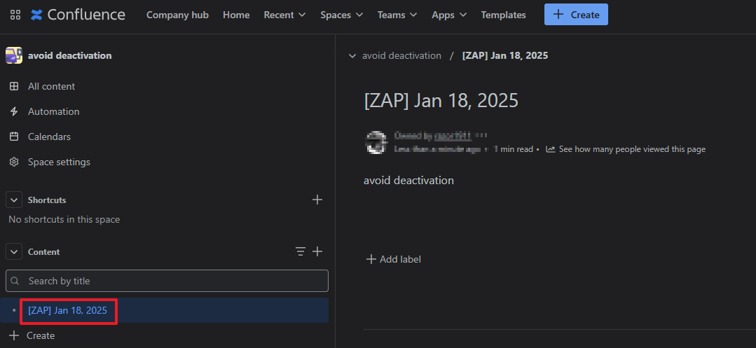 zapier 자동화 도구를 이용해서 주기적으로 Confluence 스페이스에 더미 페이지를 생성시켜 활성화 상태를 유지시킨다.
