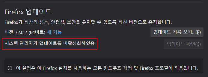 Firefox 를 재시작 한 후, 업데이트 설정 메뉴로 가보면 업데이트가 관리자에 의해 비활성화 되어 있다고 변경되어 있다.