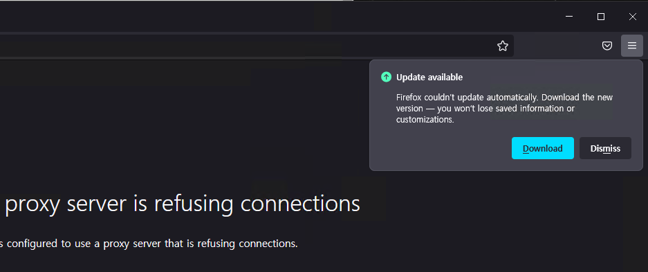 파이어폭스를 재설치하거나 수동 업데이트 할 경우, Distribution 폴더가 삭제되므로 다시 업데이트 팝업이 표시됩니다. 업데이트 후에는 다시 json 파일을 생성해주세요.