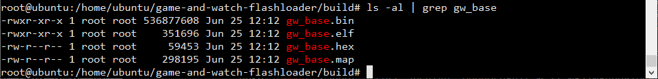 빌드에 성공하면 /home/ubuntu/game-and-watch-flashloader/build 디렉토리에 gw_base.elf, gw_base.hex, gw_base.bin 3파일이 생성됩니다.