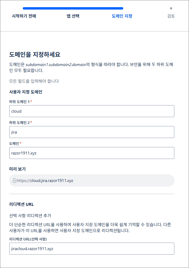 | <companyname>.atlassian.net 주소 사용 시 | 커스텀 도메인 주소 사용 시 | |