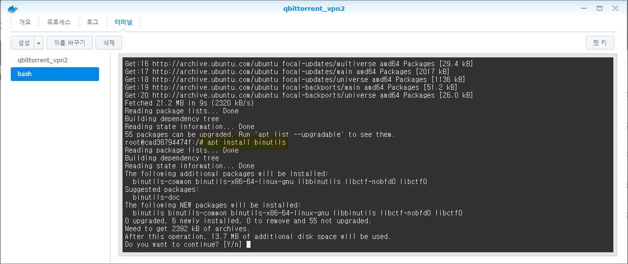 컨테이너 > 터미널 > 생성 > bash 생성 후, 아래와 같이 실행하고 컨테이너를 재시작합니다.