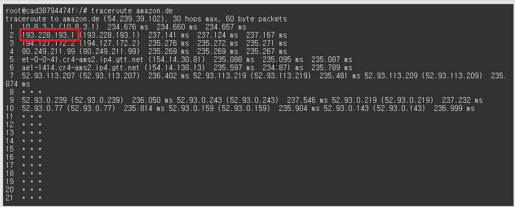 위 설명처럼 다시 컨테이너에서 bash 를 실행해서 내부에 접속 한후, traceroute 패키지를 설치합니다.