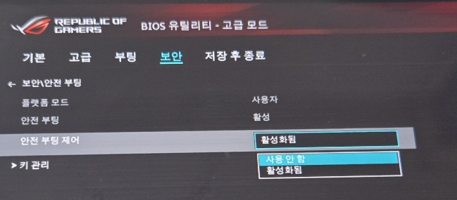 보안 탭으로 이동 후 안전 부팅 > 안전 부팅 제어 > 사용 안함을 선택한다.