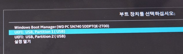 리스트 중, UEFI:USB,Partition1 (USB) 를 선택한다.