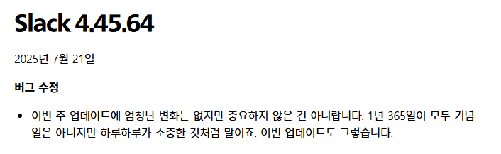 | ja-jp | 今回はアプリに大きな変更はありません。少しずつ変わっているのに変わってないように見えるのは、あなたも同じスピードで進んでいるからかも。いつも Slack のご利用ありがとうございます! 이번에는 앱에 큰 변경 사항은 없습니다. 조금씩 바뀌고 있는데 바뀌지 않는 것처럼 보이는 것은, 당신도 같은 속도로 나아가고 있기 때문일지도 모릅니다. 항상 Slack을 이용해 주셔서 감사합니다! |