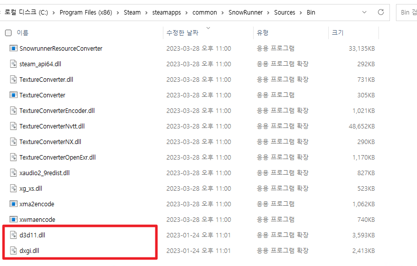 설치 폴더: C:\Program Files (x86)\Steam\steamapps\common\SnowRunner\Sources\Bin