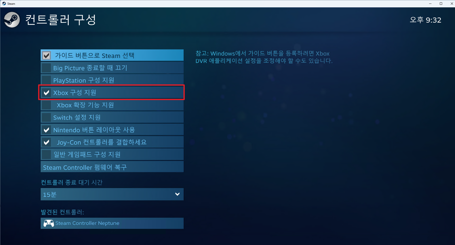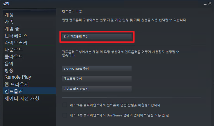 Steam 이 재시작되면 설정 -> 컨트롤러 -> 일반 컨트롤러 구성을 선택