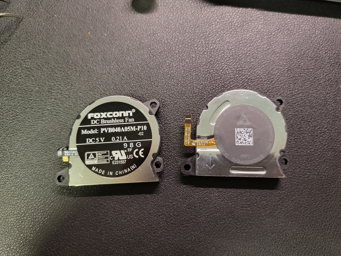 왼쪽이 폭스콘에서 제조된 정품 팬이고 오른쪽이 호환 팬입니다.