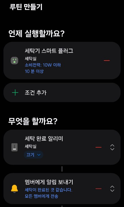 이 때, 가상 스위치 OFF 루틴에는 스마트싱스 푸쉬 알림을 보내도록 추가해둔다.