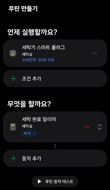 루틴1: 스마트플러그의 소비 전력이 50W 이상이 감지되면 가상 스위치를 ON 하는 루틴을 추가한다.