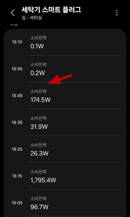 18:05 에 세탁을 시작해서 18:56 무렵에 소비전력이 0.2W 로 세탁이 완료되었음을 알 수 있다.