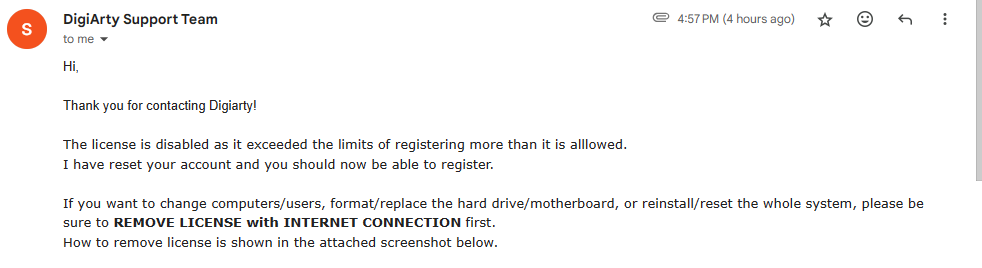 1. VideoProc Convter 라이선스를 구입할 때 받은 라이선스 정보 이메일이 있을 것이다. 해당 이메일을 찾아서 "회신" 으로 support@videoproc.com 로 라이선스 초기화 요청메일을 보낸다.
