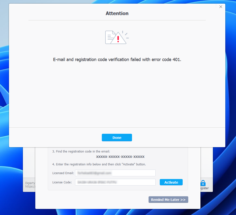 VideoProc Converter 라이선스 인증 시도 시, 401 에러가 발생하며 인증이 되지 않음.