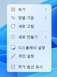Windows 11 에서는 마우스 우클릭 메뉴를 보면 메뉴가 간소화 되어 있다. (일명 모던 UI)