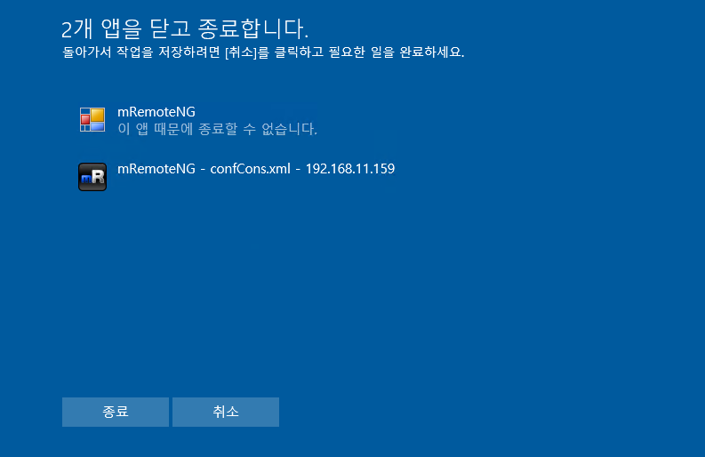 - 프로그램이 응답이 없거나 네트워크 통신 중인 상태라서 즉시 종료가 안되는 상황. ex) 클라우드 동기화, USB 장치 데이터 전송 등