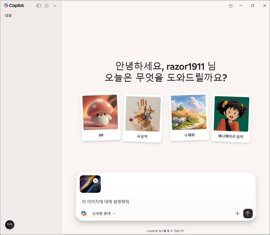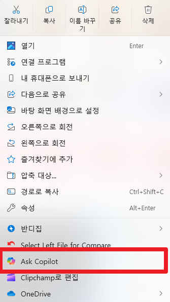 25H2 부터는 Copilot 기능이 강화되어서 아래와 같이 사진 폴더에서 사진을 우클릭하면 바로 Copilot 을 통해 해당 사진을 첨부해서 질문을 할 수 있다. 다만 이 기능은 OS에 Copilot 이 설치되어 있는 경우에만 활성화 된다.