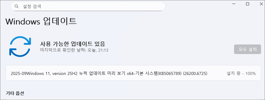 추가로 이어서 Windows 업데이트 메뉴를 통해 25H2 용 업데이트를 설치한다.