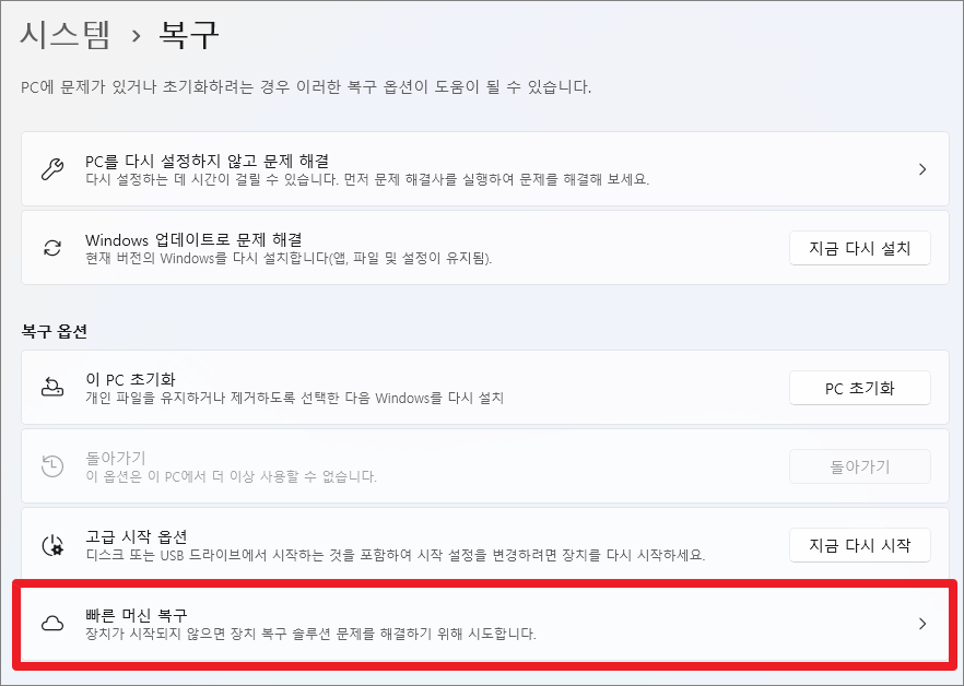 24H2 말미에 추가된 기능으로 QMR (Quick Machine Recovery) 기능이라고 부른다.