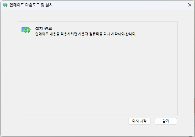 잠시 후 설치가 완료되면 재시작이 필요하다.